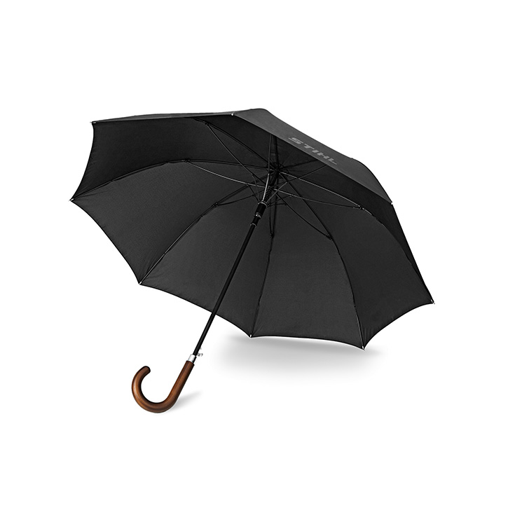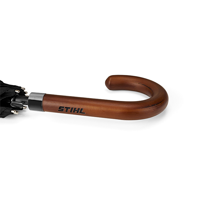 Çadra e fortë e cilësisë së lartë, me hapje automatike, ka një dorezë të përbërë prej druri të certifikuar me FSC. Një çadër tërësisht normale? Aspak! Sepse në sajë të dy segmenteve me emblemën STIHL, çadra jonë ka edhe dy segmente të tjera shtesë me emblema të printuara mbi to. Kjo do të thotë se dy logot shtesë STIHL duken qartë kur çadra laget – por shpresojmë të mos bjerë shi së shpejti!