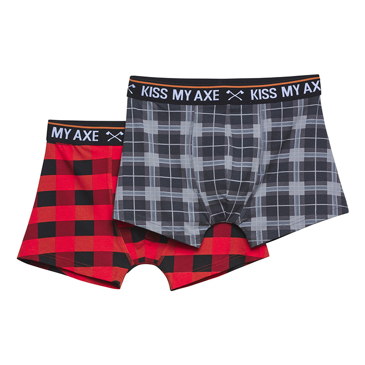 Klasiket, tani vijnë edhe në modelin me kuadrata. Ky set të brendshmesh është i disponueshëm në dy ngjyra të ndryshme, të zeza dhe të kuqe me kuadrata. Shkronjat “KISS MY AXE” të qëndisura tek shiriti elastik i belit e kompletojnë edhe më mirë këtë dizajn kaq modern.